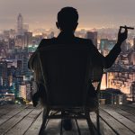 Silhouette of businessman sit on chair and hold a cigar and looking at the city in night.